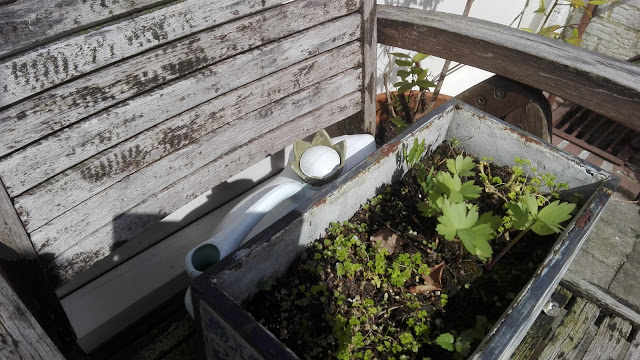 Kijk dit zie ik nu graag. Kruiden die vanzelf opkomen! De lavas (grote blad) had ik vorig jaar gekocht (op verzoek van Stud) maar die werd meteen opgegeten door slakken. Maar hij komt nu sterker terug! En de peterselie heeft de winter ook weer overleefd. Gewoon in een pot, in de tuin, op een oude tuinstoel!